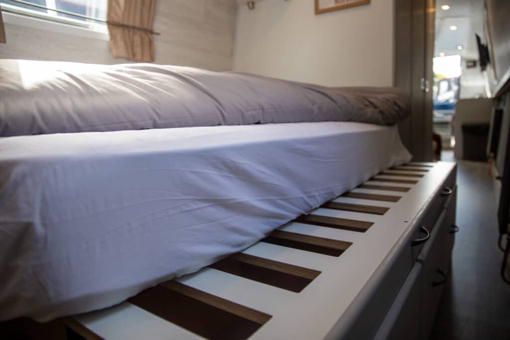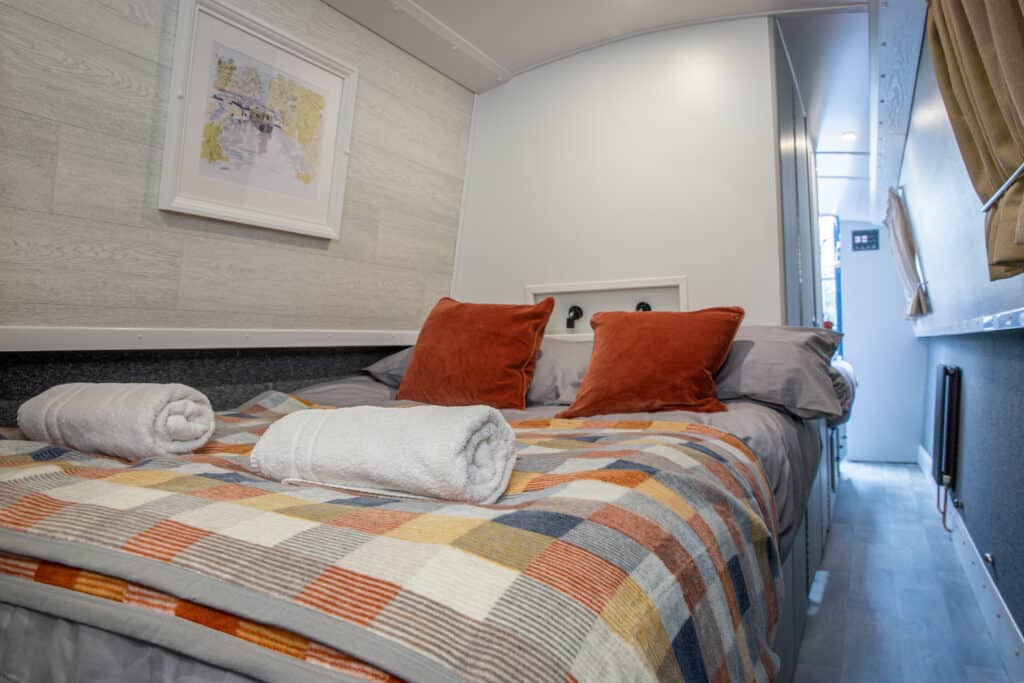 Cabins: Three cabins, all with flexible layouts of either double or single beds in each. Double beds measure 6’3″ x 4′ when extended they are 6’3 x 5′ with interior sprung mattresses. Single beds measure 6’3″ x2′ with interior sprung mattresses. Bed linen is provided and one bath towel for each guest.