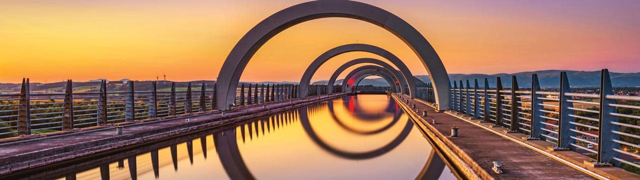 Our stunning Glasgow canals and Edinburgh canal boat holiday cruise begins at the Falkirk Wheel, one of the most stunning backdrops to any canal in the UK. The Wheel, around the height of eight double decker, is the world’s first rotating boat lift.